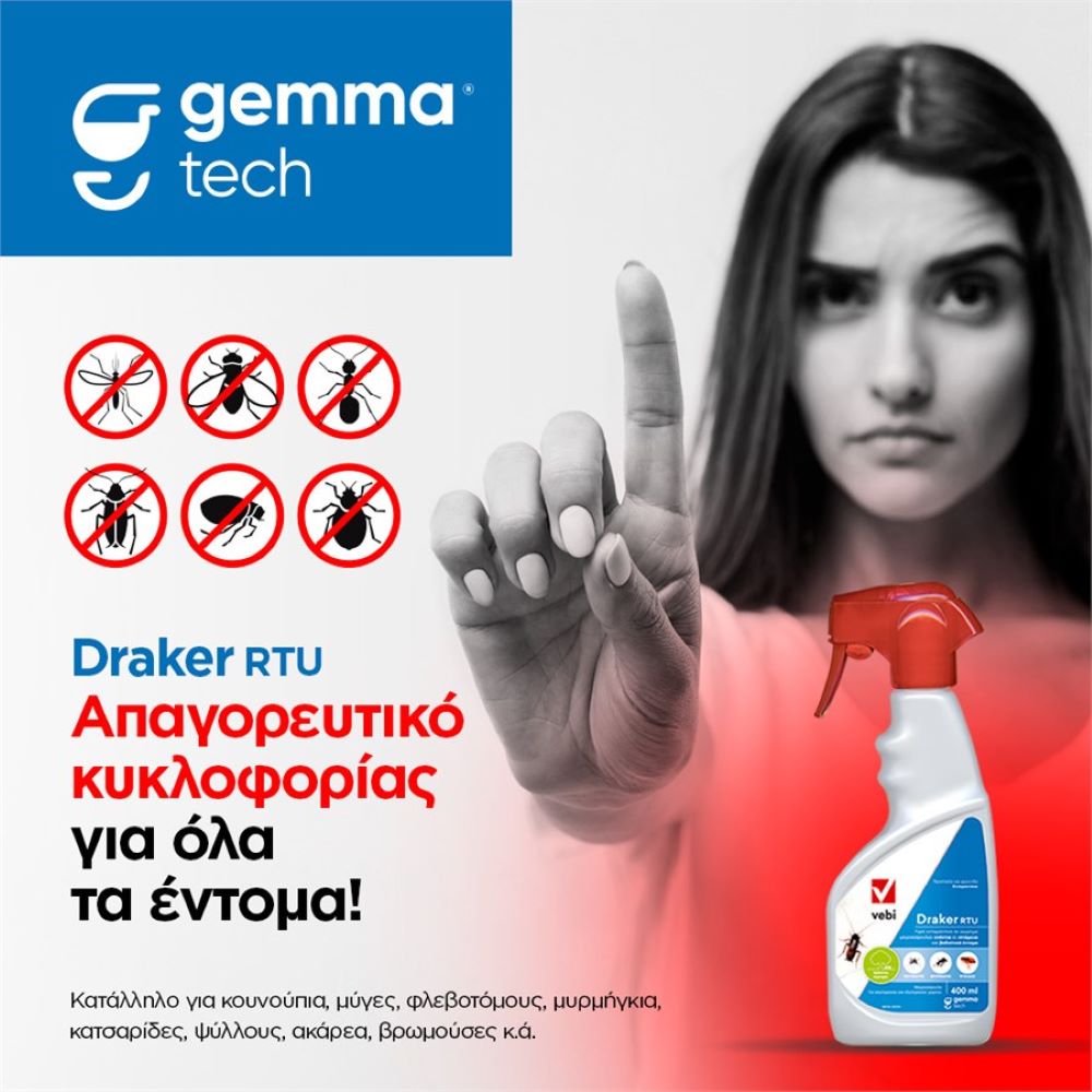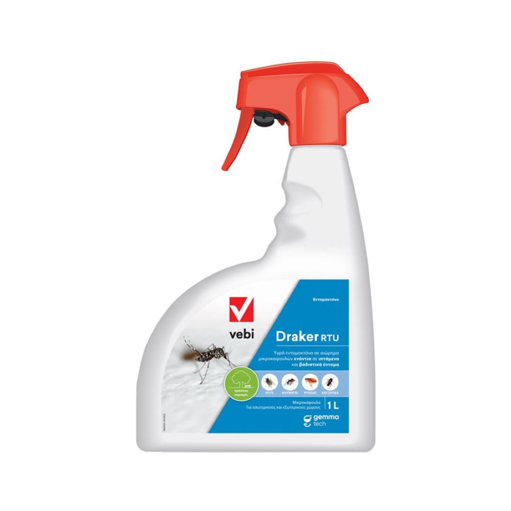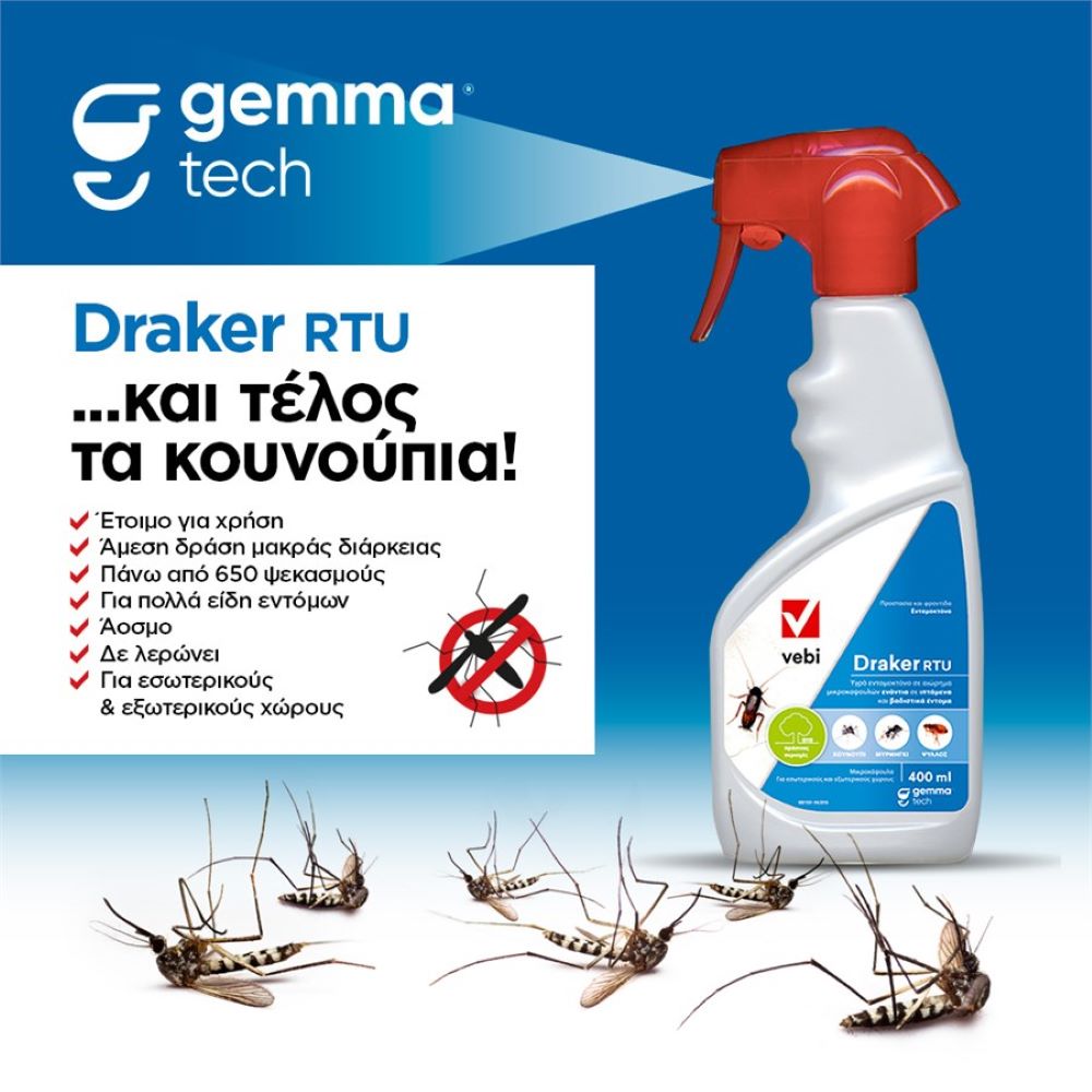 Το Draker RTU είναι ένα σύγχρονο εντομοκτόνο, το οποίο καταπολεμά πολλά έντομα στόχους, όπως κουνούπια, κουνούπια τίγρης, ψύλλους, κατσαρίδες, μυρμήγκια, βρωμούσες, ακάρεα, μύγες κ.ά.